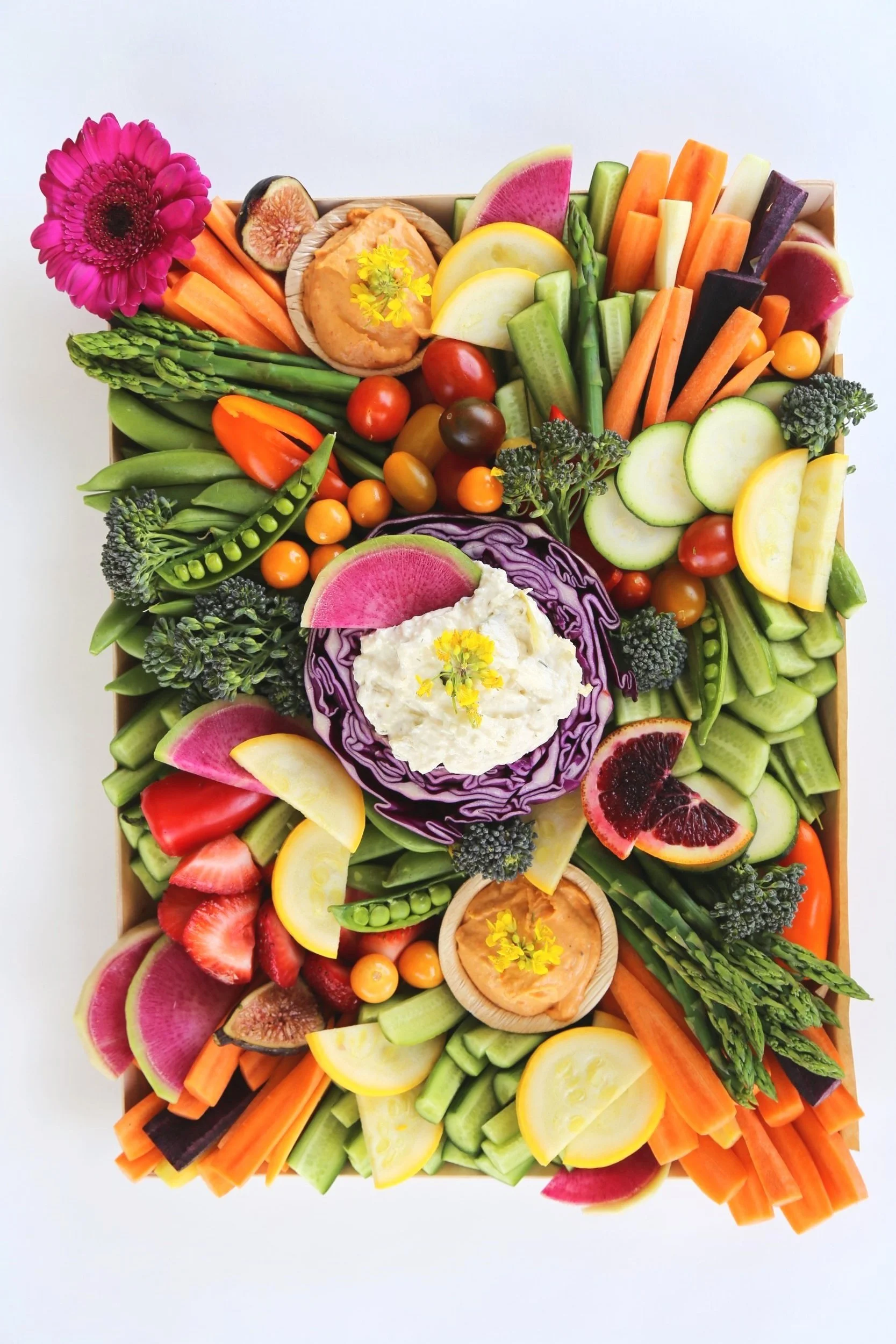 Our Crudité Board includes Assorted Seasonal Vegetables, Dips, and Fruit. All Beautifully Presented.